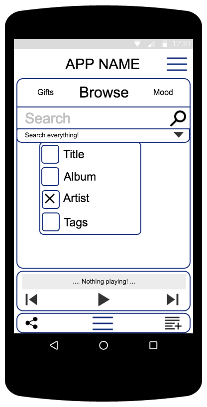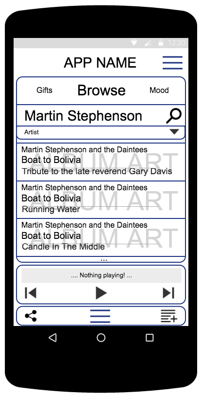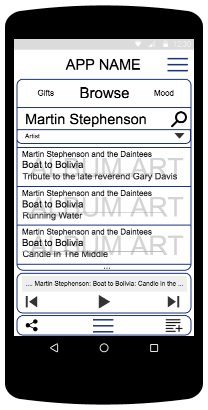With 'Artist' selected, Alice types in the name of a noted and amazing artist, who you really should listen to, by the way.