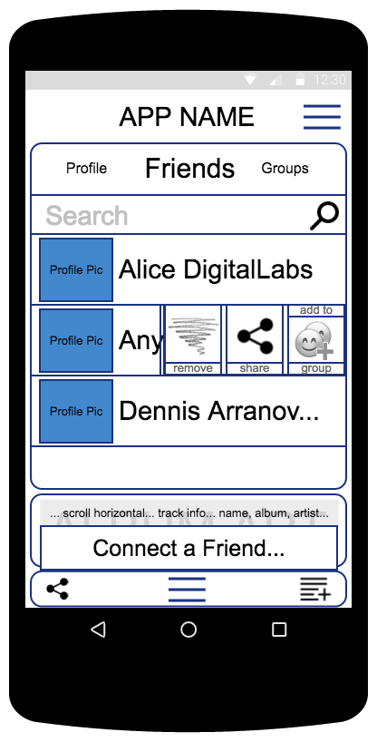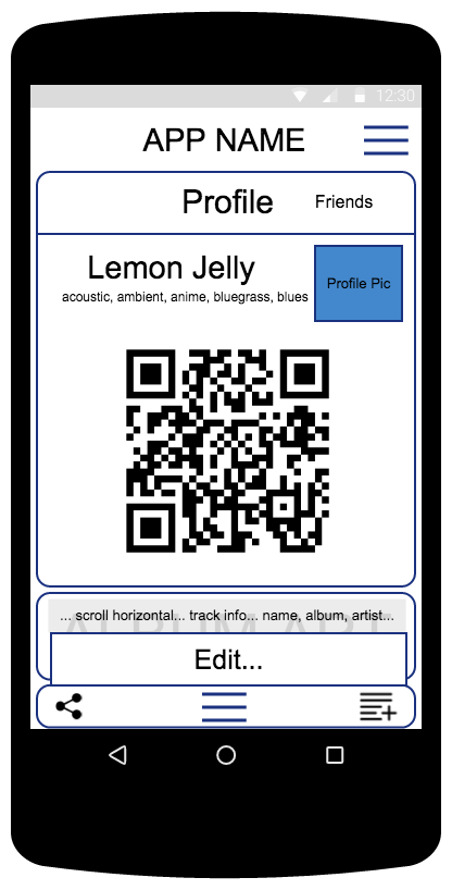 Shows the profile view, containing the information the user would show publicly to a friend, when connecting to them: