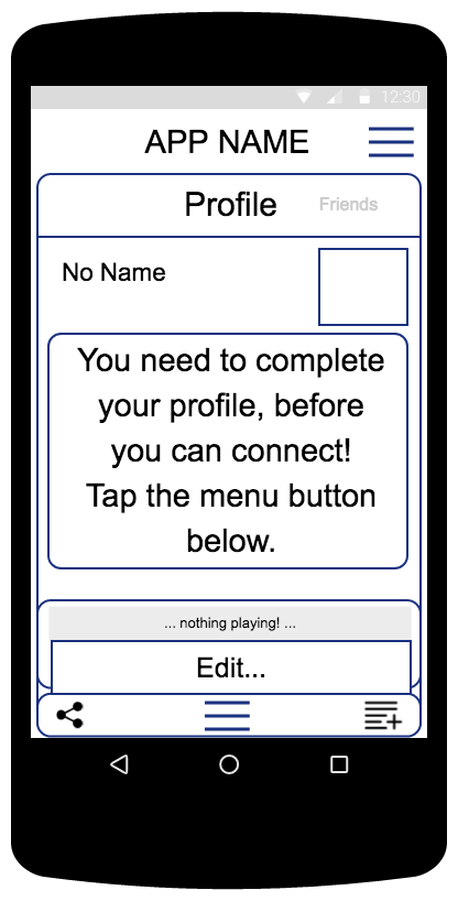 1. Nicole is at the Action Tab: Profile. The app has just started. There is a big notice telling her that she needs to complete her profile before she can do anything else.